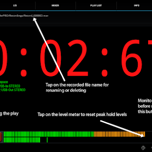 • Level meters for playback and recording with peak hold to see what your loudest peak was (tap on level meter to clear)